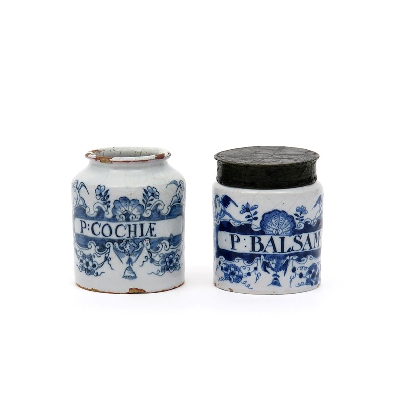 Two small delftware cylindrical pill jars early 18th century, both painted with winged putti flanking flower stems and large shells above banners inscribed 'P:COCHIÆ', and 'P:BALSAM', the latter with a metal cover, a little chipping, 9.3cm high. (3)