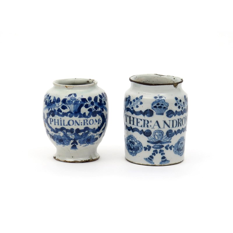 Two small delftware dry drug or pill jars 1st half 18th century, both painted in blue with birds among branches flanking a basket of fruit, one cylindrical and inscribed 'THER:ANDROM', the other ovoid and inscribed 'PHILON:ROM', small faults, 9.8cm max. (2)