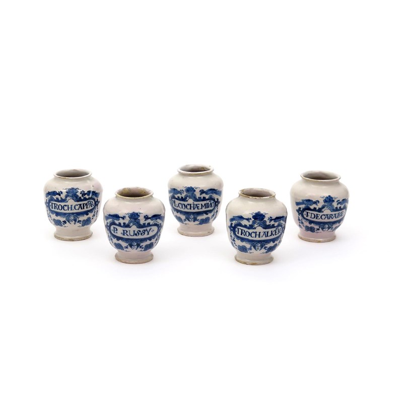 A rare set of five London delftware dry drug or pill jars c.1720, painted in blue with peacocks flanking baskets of fruit above inscribed banners, titled 'PL:COCHIÆ MINO', 'TROCH.CAPPAR', 'P:RUSSY', 'T:DECARRABE' and 'TROCH.ALKEK', some glaze chipping, 9.6cm. (5)