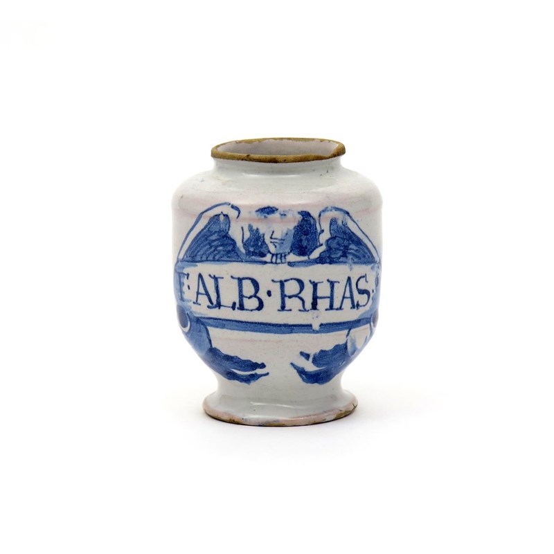 An early small delftware dry drug or pill jar c.1680, painted in blue with an angel with outstretched wings above a banner inscribed 'T.ALB.RHAS', a chip to the inside rim, 10cm high.