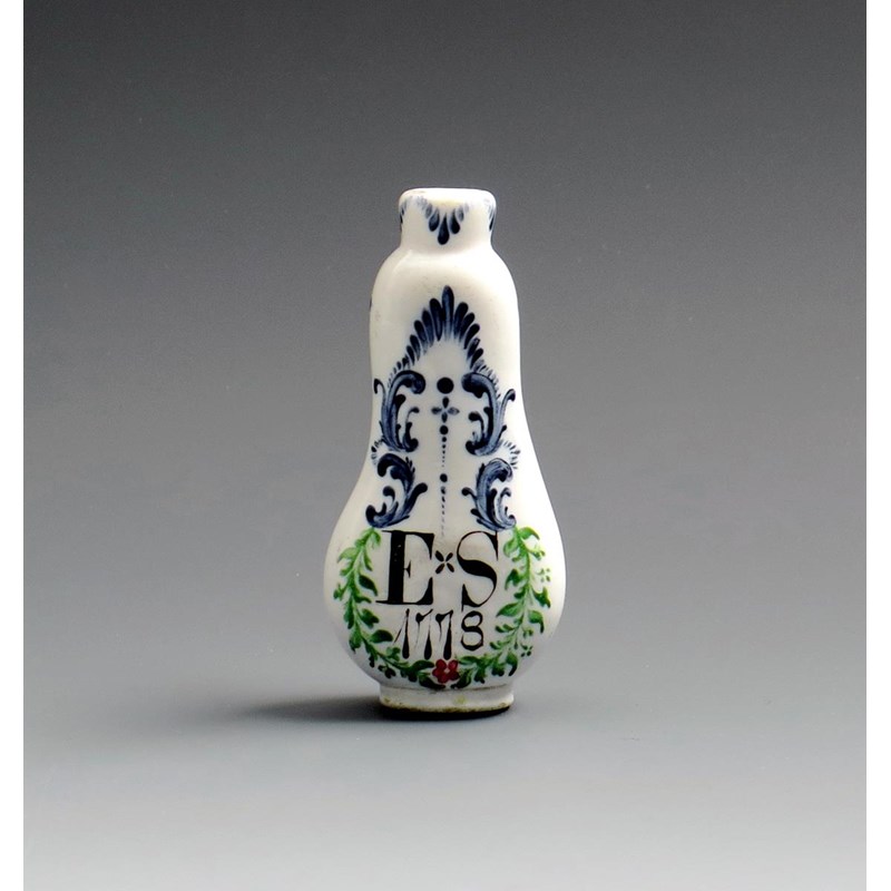 A rare white opaque glass scent bottle dated 1778, probably Beilby, Newcastle-upon-Tyne, of flattened pear shape, painted in black enamel with the initials E * S and the date 1778, with a blue and green foliate surround, the reverse painted with pink roses and buds, 7.3cm. high.
