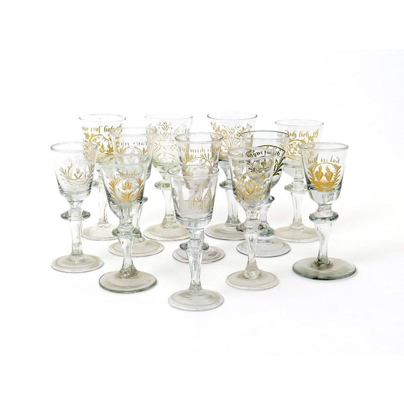 Twelve German 'Friendship' glasses 18th/19th century, with bucket-shaped bowls engraved and gilded with hearts, flowers and birds beneath differing sentiments of love and friendship, raised on varying knopped stems above folded feet, 16cm max. (12)