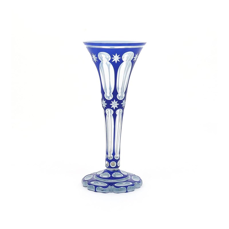 A Bohemian double-overlay glass vase 19th century, the flared form flashed in blue and white and cut with large panels and small stars, 29.5cm.