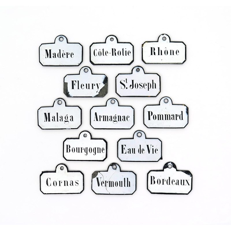 Thirteen Continental enamel bin labels 19th/early 20th century, of chamfered rectangular form, variously inscribed in black including 'Vermouth', 'St Joseph', 'Pommard', 'Bourgogne' and 'Armagnac', 7cm. (13)
