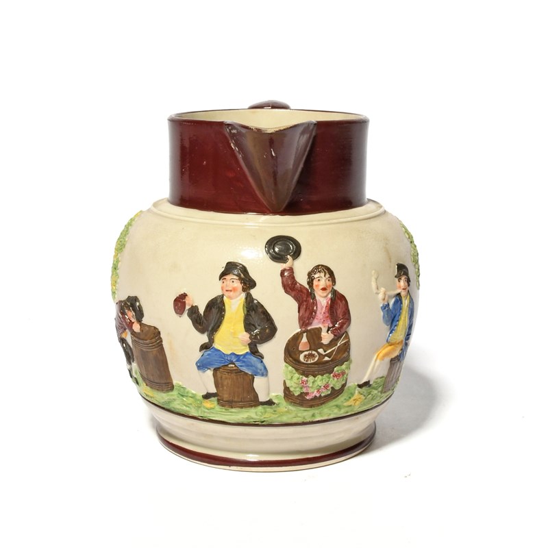 A dry-bodied stoneware jug, 1st half 19th century, sprigged with a scene of four topers seated on