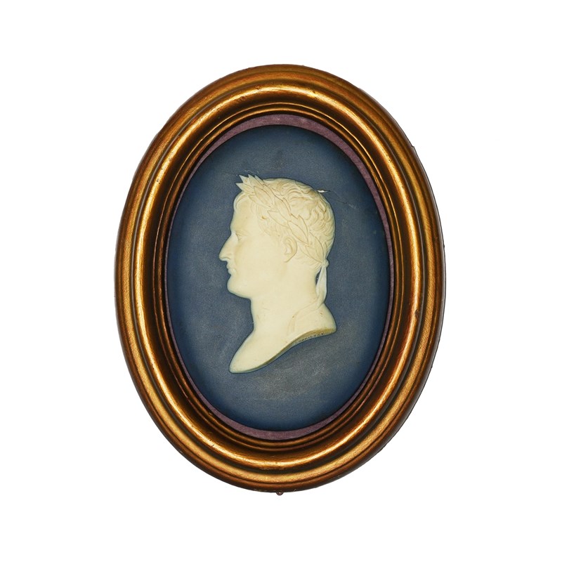A Wedgwood Jasper ware portrait plaque of Napoleon, 1st half 19th century, after Bertrand Andrieu for Sèvres, modelled in relief in white on a dark blue ground, the bust inscribed 'Andrieu', impressed Wedgwood mark to the reverse, broken and restuck, the plaque 15.7cm.