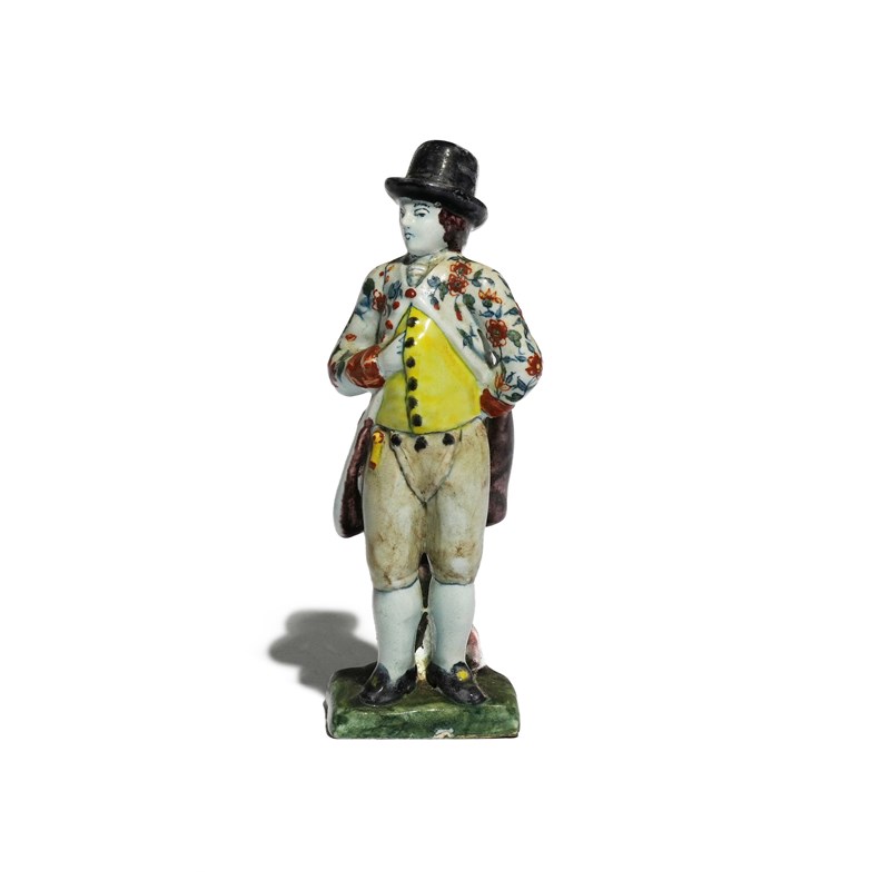 A rare Delft figure, 2nd half 18th century, of a man standing with his right hand tucked into his yellow waistcoat, wearing a tall hat and flowered jacket, raised on a square green base, blue monogram mark, 17.5cm.