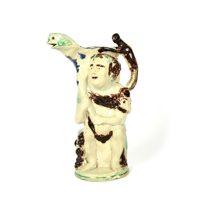 A large Ralph Wood 'Pan and Bacchus' jug, c.1780-90, the corpulent god holding a cornucopia with