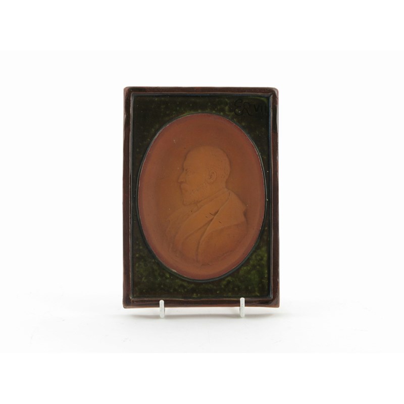A Royal commemorative Dicker Pottery (Sussex) plaque of Edward VII c.1910, shown in profile and inset in a green-glazed surround, the reverse incised with his dates, impressed mark, 19.5cm.