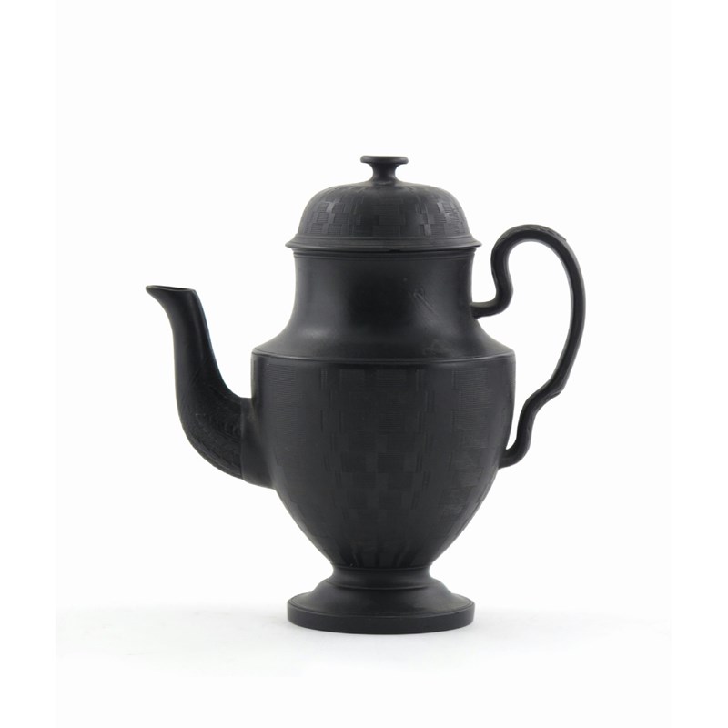 A black basalt coffee pot and cover 19th century, turned with a geometric design and raised on a circular foot, a tiny chip to the cover's rim, 24cm. (2)