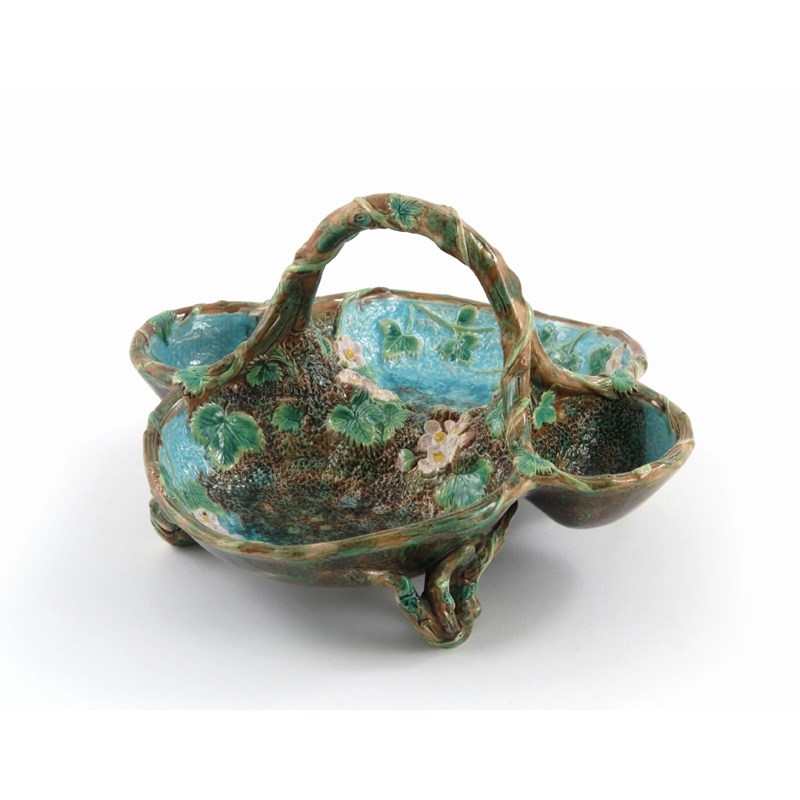 A George Jones Majolica strawberry basket c.1873, modelled with four compartments trailed with flowering and fruiting strawberry branches, impressed factory mark and registration diamond, 30.5cm.
