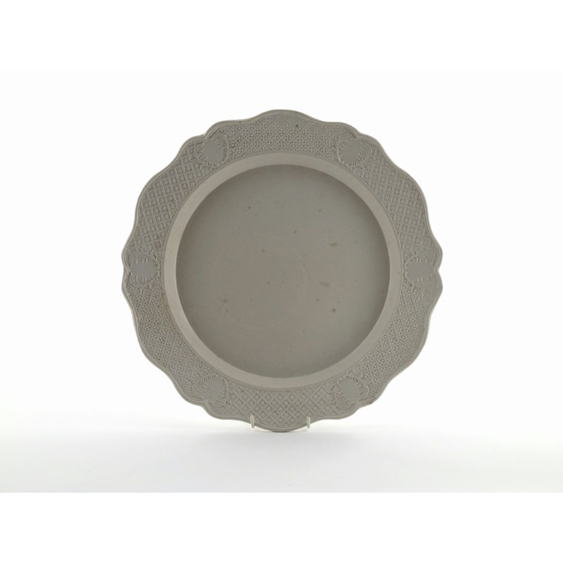 A large salt-glazed stoneware charger c.1800, the shaped rim moulded with diaper panels, a small rim chip, 39cm.