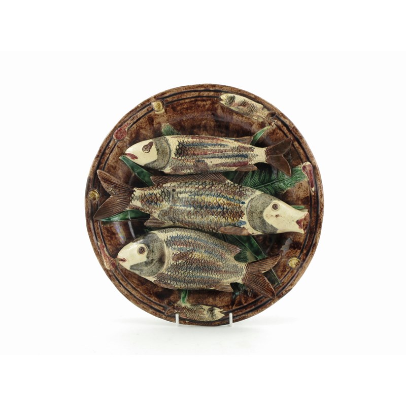 A large Portuguese Palissy-type dish early 20th century, the well filled with three fish laid head to tail with seaweed behind, the rim applied with shrimps, smaller fish and shells, impressed mark for M. Mafra, Caldas da Rainha, 32.5cm.