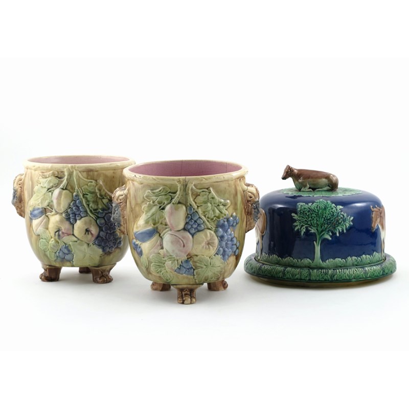 A Majolica cheese bell and stand 19th century, moulded with cows standing on grass, and two Majolica coolers or vases, moulded with fruit and raised on three feet, some damages, 26cm max. (4)