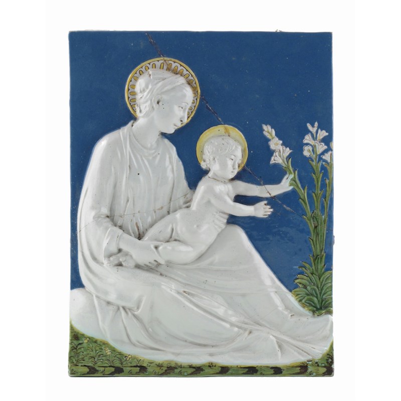 A Cantagalli plaque of the Madonna and Child 19th century, after Della Robbia, the Infant King reaching out to grasp a lily stem, cockerel mark to the reverse, broken and repaired, 44cm.
