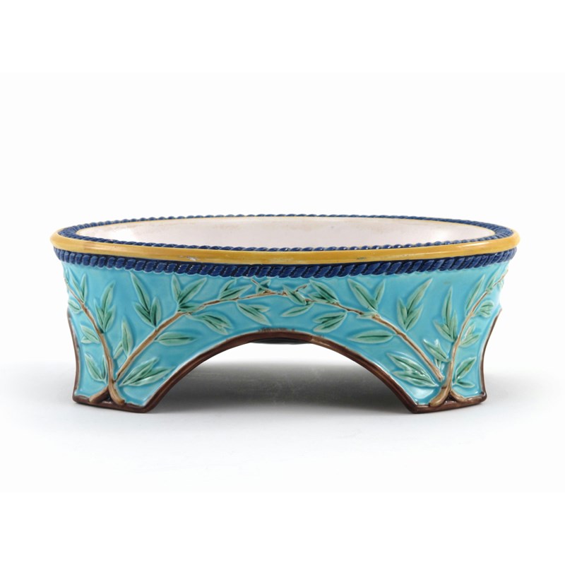 A George Jones Majolica dog bowl c.1870, the sides moulded with crossed leafy stalks supporting the oval bowl, blue pad mark, rim chip, 25cm dia.
