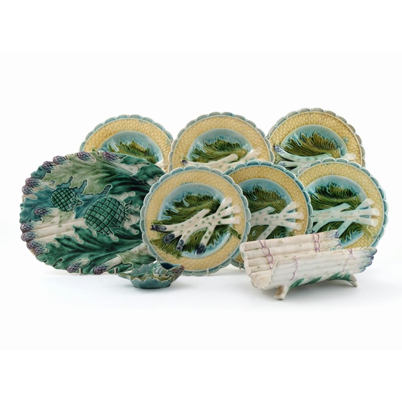 A Majolica asparagus service 19th century, moulded with asparagus spears and leaves within basket borders. Comprising: a large platter, an asparagus server, a small dish and six plates. (9)
