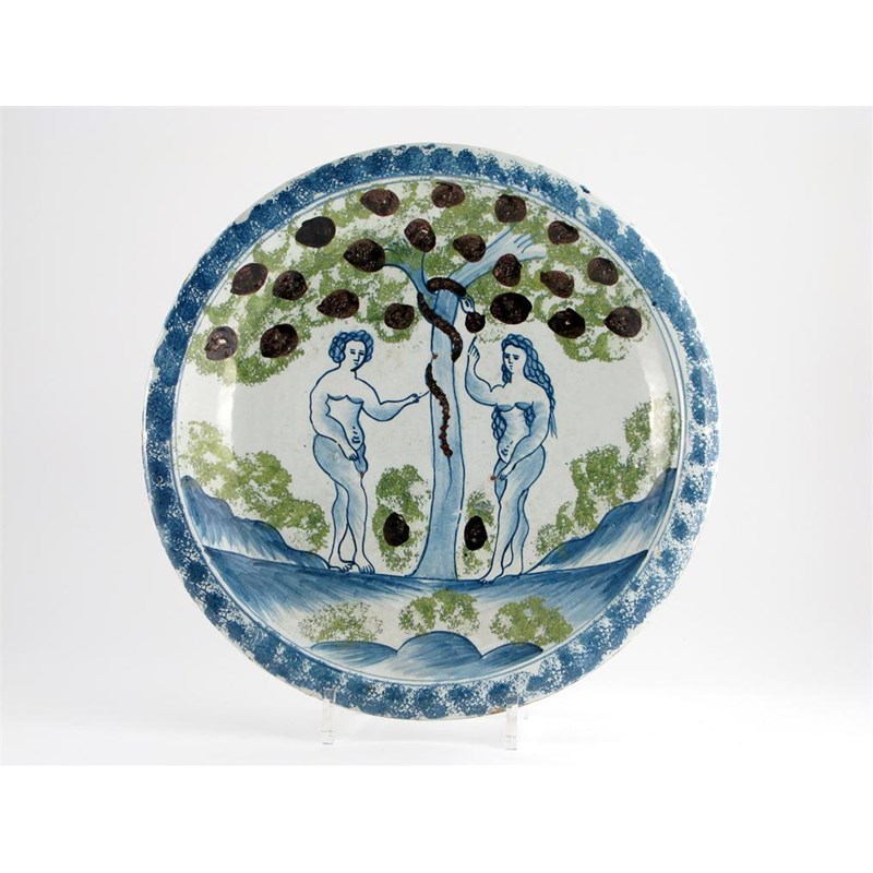 A good Delftware Adam and Eve charger, painted and sponged in blue, green and manganese with the fateful couple either side of a tree in which sits the serpent, proffering the forbidden fruit to Eve, c.1740, 33.6cm.