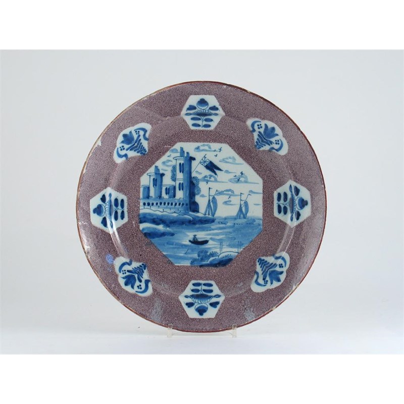 A Delftware charger, probably Wincanton or Bristol, painted in blue with a castle surrounded by boats within an octagonal panel, stylized flowers in panels around the border, on a powdered manganese ground, c.1740-50, 29.5cm. Cf. Anthony Ray, English Delftware Pottery, Plate 25 for similar examples.