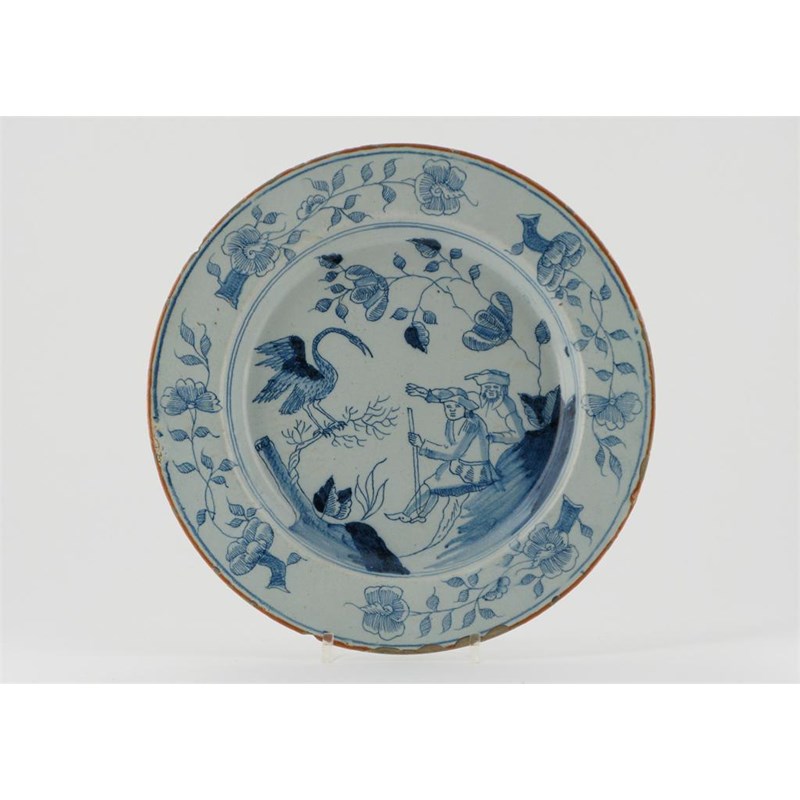 A Delftware blue and white plate, painted with two travellers conversing with a swan, within a floral border, brown line rim, mid 18th century, some chipping and glaze wear to the rim, 27cm.