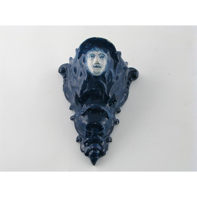 A Delftware blue wall pocket, the upper section moulded and painted with a human face with eyes raised heavenward, the lower formed with ungodly features, mid 18th century, broken and repaired, 21cm.