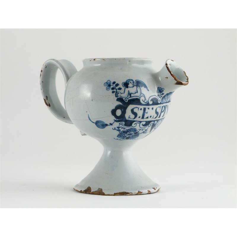 A small Delftware wet drug jar, painted in blue with the inscription 'S:E:Spin:Cerv' within a scrolling cartouche of cherubs, shells and floral motifs, with strapwork handle and raised on a flared foot, c.1730-50, minor chipping, 17.5cm. Cf. John C. Austin, British Delft at Williamsburg, p.228 pl.539 for a similar example.