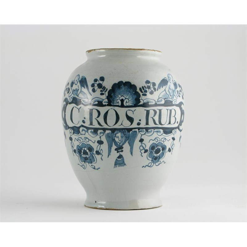 A Delftware dry drug jar, painted in blue with the inscription 'C.Ros.Rub' within a cartouche of bald cherubs and stylized flowers, blue line mark to the base, c.1740-60, small restored footrim chips, 20cm. The inscription relates to the preparation Conserve of Red Roses, used as a treatment for consumption because of its soothing properties on the digestive and respiratory systems.