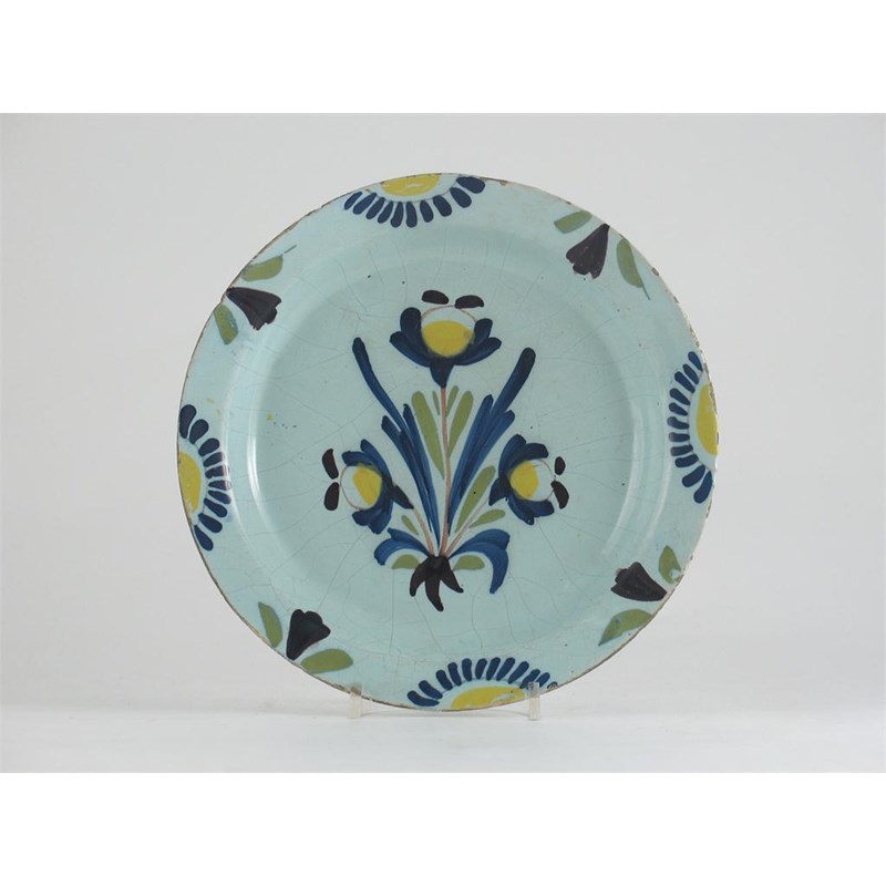 A Delftware plate, probably Lambeth, painted in polychrome enamels with stylized tulips on a pale blue ground, c.1720-30, some crazing to the glaze, 23cm.