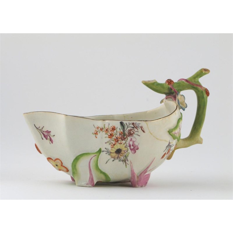 A Chelsea strawberry leaf sauceboat, the handle formed as a stalk, painted with flower sprays in polychrome enamels, red anchor mark, c.1754, damages and restoration, 20.4cm.