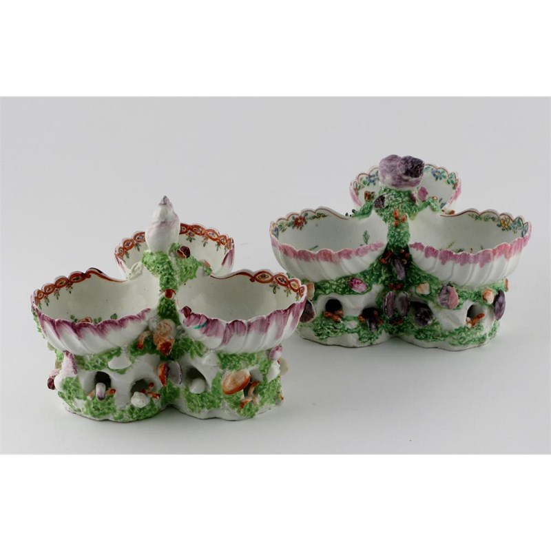 Two Bow triple shell salts, or sweetmeat dishes, each raised on a pierced base, encrusted with shells and brightly painted in polychrome enamels, unmarked, c.1755-60, both with damage and restoration, 18cm. (2)