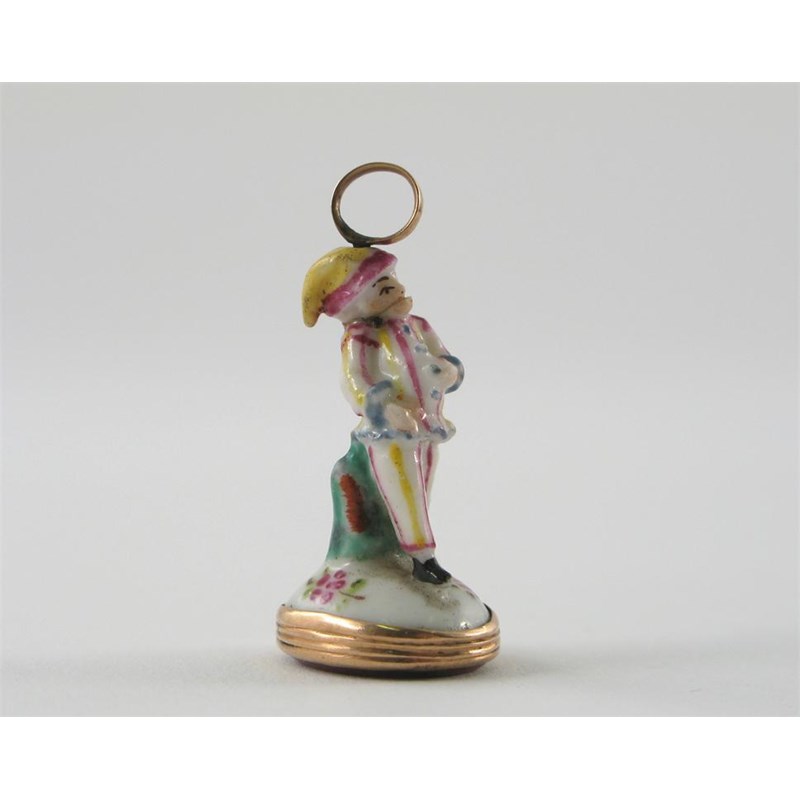 A Chelsea seal modelled as Punch, dressed in a striped costume, the seal underneath engraved with a blackbird holding a branch in its beak and the motto 'Ia l'aimie Liberte', probably for the Merle family, c.1765, the head broken off and reglued, 3.4cm.