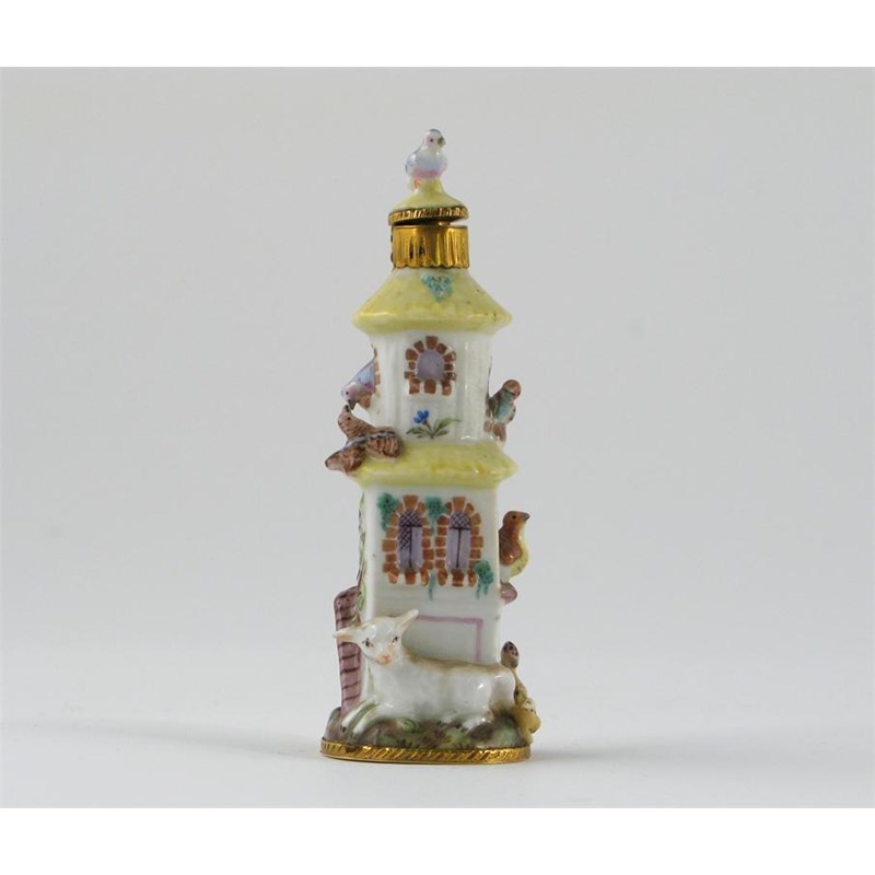 A Continental porcelain scent bottle, moulded as a dovecote atop a chicken coop, two hens poking their heads through the window, a third mothering her chicks near a recumbent lamb, a gilt floral design to the base, 2nd half 19th century, two birds' heads restored, 9.3cm.