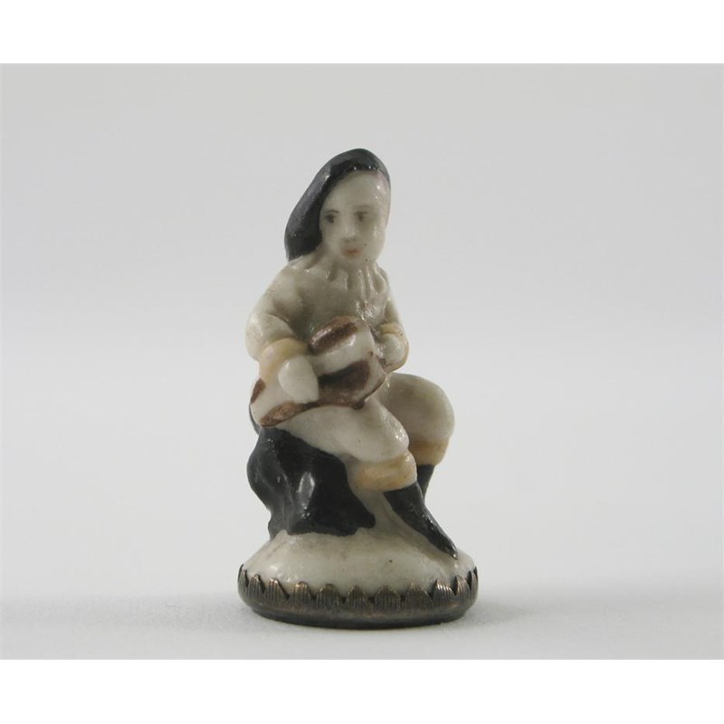 A Chelsea seal, modelled as a hurdy-gurdy player, wearing a black cloth hat, a stone seal underneath with metal mount, c.1765, 3.4cm.