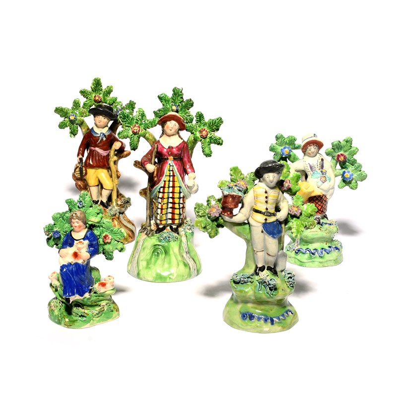 Two pairs of Walton pearlware figures, c.1800-20, the smaller pair of gardeners, standing before flowering bocage with a watering can and a spade, the larger pair of haymakers, he with a small barrel and a staff, she with a rake and a small jug or mug, with a small figure of a girl seated with three lambs, some restoration, 18cm max. (5)
