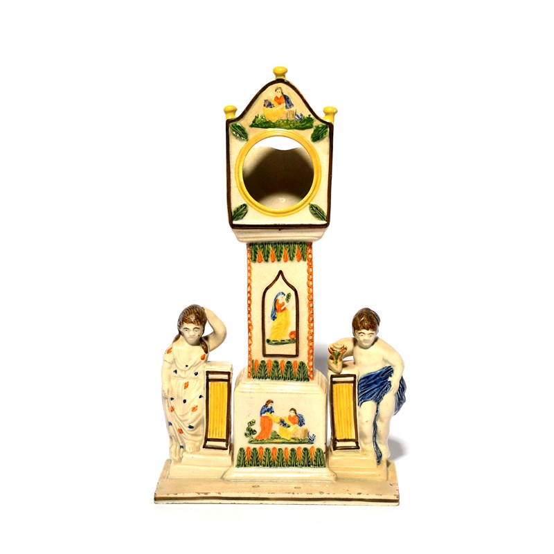 A Pratt ware watch stand, c.1820, probably Dixon Austin & Co, modelled as a longcase clock flanked by two children in Classical dress, the case moulded and painted with further figures, decorated in a typical palette of blue, green, yellow and ochre, some restoration, 27.8cm.