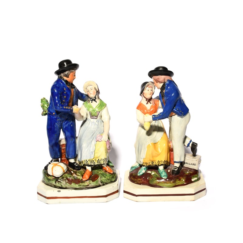 A pair of Staffordshire figure groups of sailors, early 19th century, depicting The Sailor's Farewell and The Sailor's Return, modelled with his sorrowful and relieved lass, raised on unusual octagonal bases, small restorations, 24.5cm. (2)