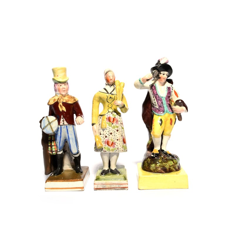 Three Staffordshire figures, c.1810-20, two of theatrical interest, one of John Liston in his role as Lubin Log from Love, Law and Physic, the other of Madame Vestris as the Broom Girl, the last figure emblematic of Fire, holding a magnifying glass and a flaming torch, dressed in a theatrical fashion and raised on a yellow square base, some restoration to Madame Vestris, 16.5cm max. (3)