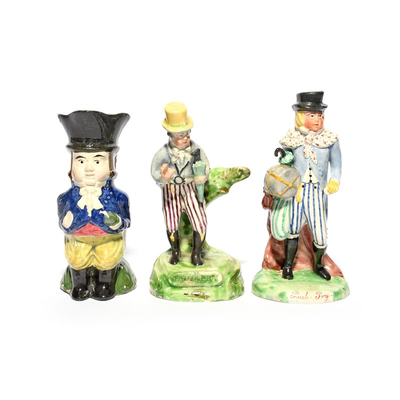 Two Staffordshire theatrical figures of the actor John Liston, c.1820, in his roles as Paul Pry and Lubin Log (the latter erroneously titled), applied Salt label to the reverse, and a small Staffordshire jug also modelled as Liston playing Paul Pry with an umbrella tucked under his arm, some restoration, 16.5cm max. (3)