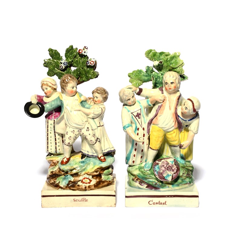 A pair of Staffordshire pearlware figure groups, c.1800, of squabbling children, each modelled with a central boy being set upon by two girls beneath flowering bocage, raised on square bases titled 'Contest' and 'Scuffle', some restoration, 20cm. (2)