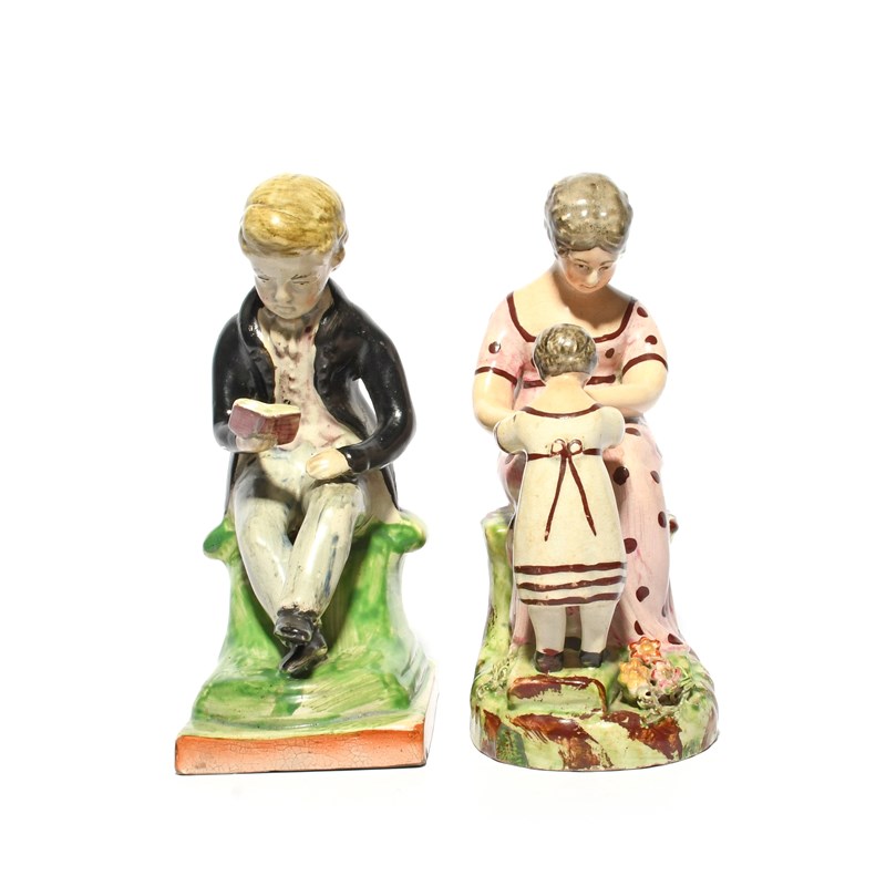 Two Staffordshire figures in Regency dress, c.1820, one of a young woman seated on a rocky stump and playing with a young girl standing before her, the other of a boy reading from a book held in his right hand, minor chips and restoration, 16.8cm max. (2)