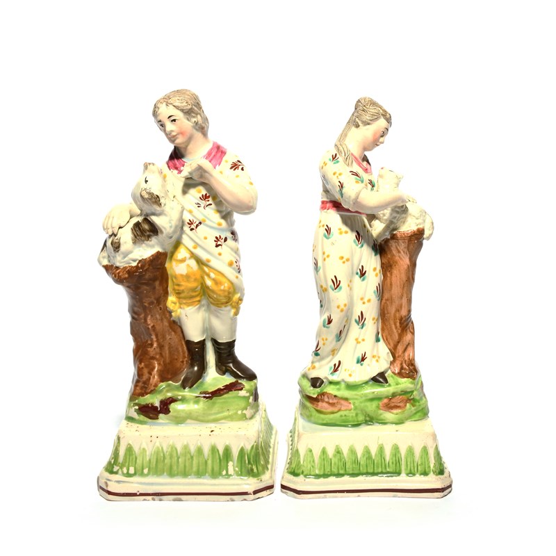 A pair of Staffordshire figures of children, c.1800, each standing beside a tall stump, the boy with a dog, the girl with a lamb, each raised on a chamfered square base moulded and painted with a band of stiff leaves, small chips to the bases, 19.5cm. (2)