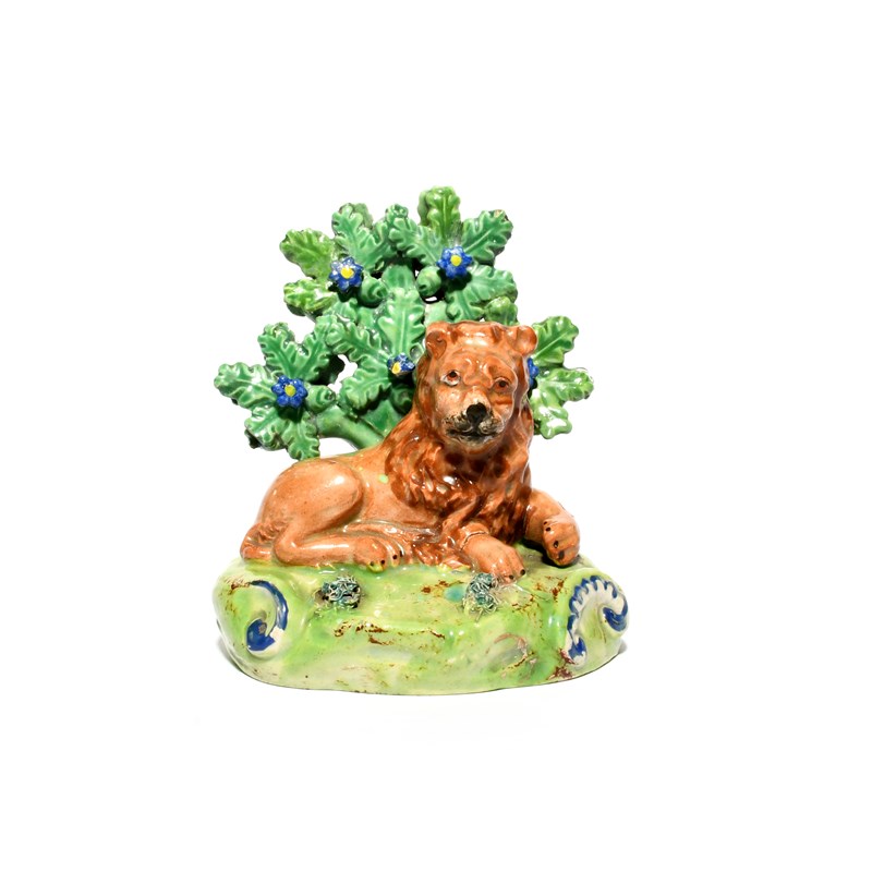 A Walton (Staffordshire) figure of a lion, c.1810-20, recumbent beneath flowering bocage with head