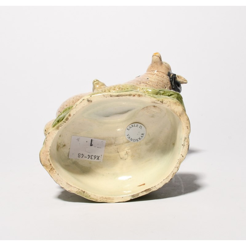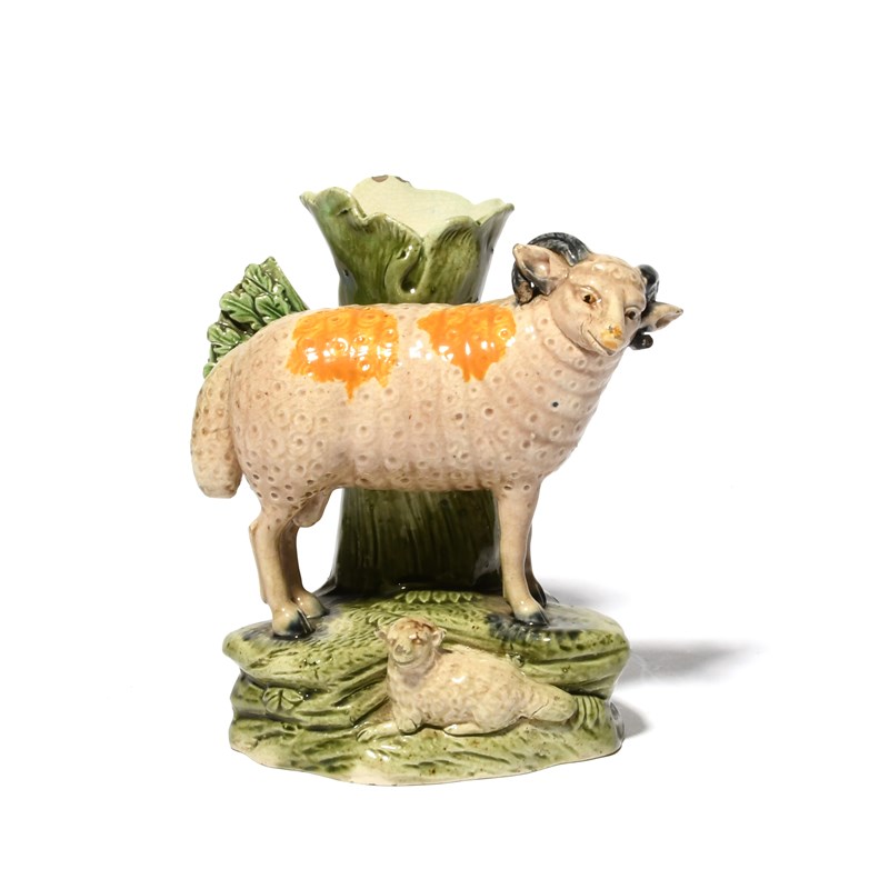 A Staffordshire pearlware spill vase, c.1800, modelled with a sheep standing over a recumbent lamb