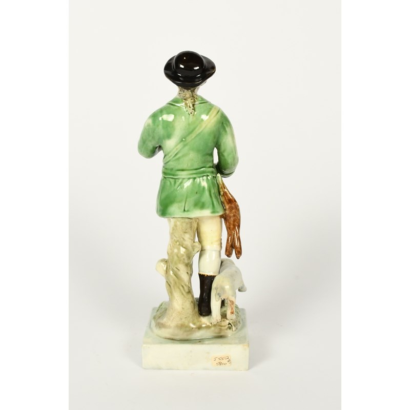 A Ralph Wood figure of a huntsman, c.1785-90, a brace of rabbits suspended from his belt, his dog