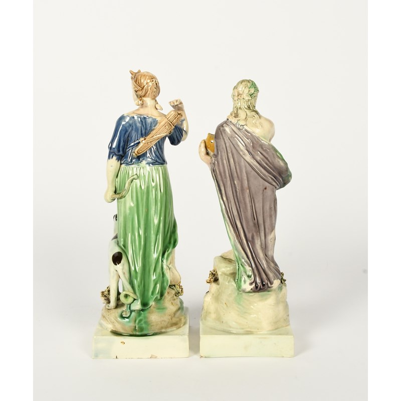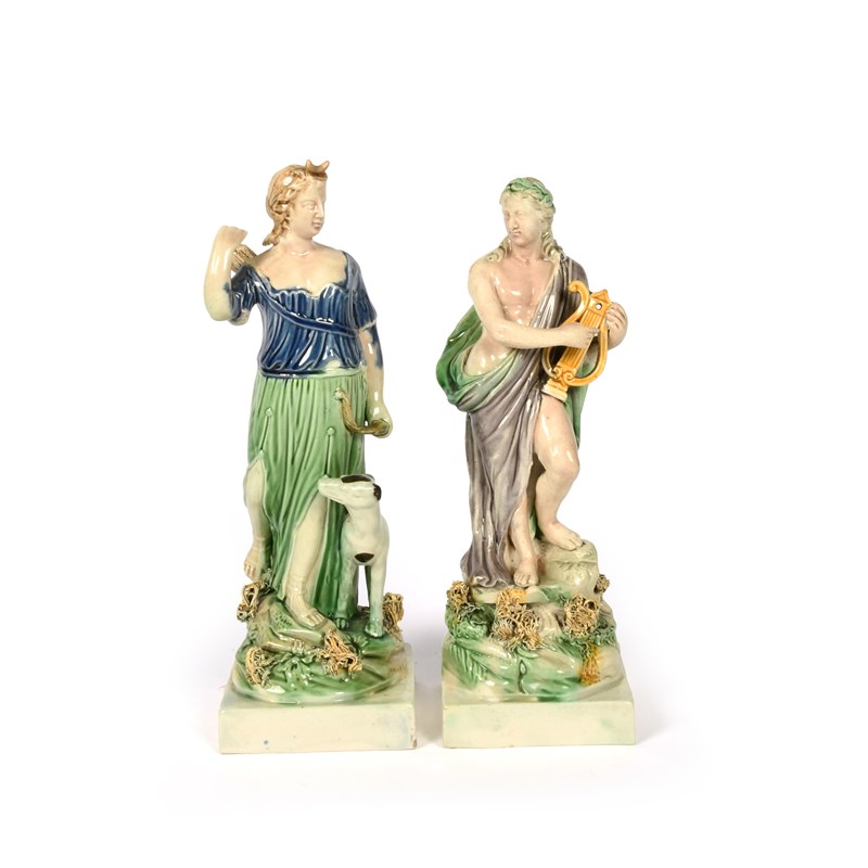 A pair of Ralph Wood figures, c.1785, of Apollo and Diana, standing on rocky stumps raised on square bases, Apollo holding a lyre and wearing a laurel crown, Diana holding a bow and drawing an arrow from a quiver, her dog at her side, washed in a muted palette of green, blue, grey and ochre, a small amount of good restoration to one, 23cm. (2)