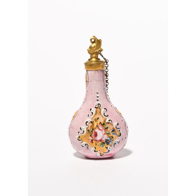 A Bilston or South Staffordshire enamel scent bottle, late 18th century, the flattened pear shape decorated to one side with a bird perched on fruit, the reverse with a panel of flowers on a gold ground, reserved on a pink linen ground, with gilt metal mounts, the stopper formed as a dolphin, 8.5cm.