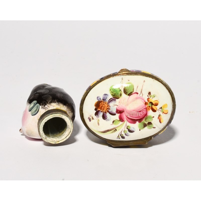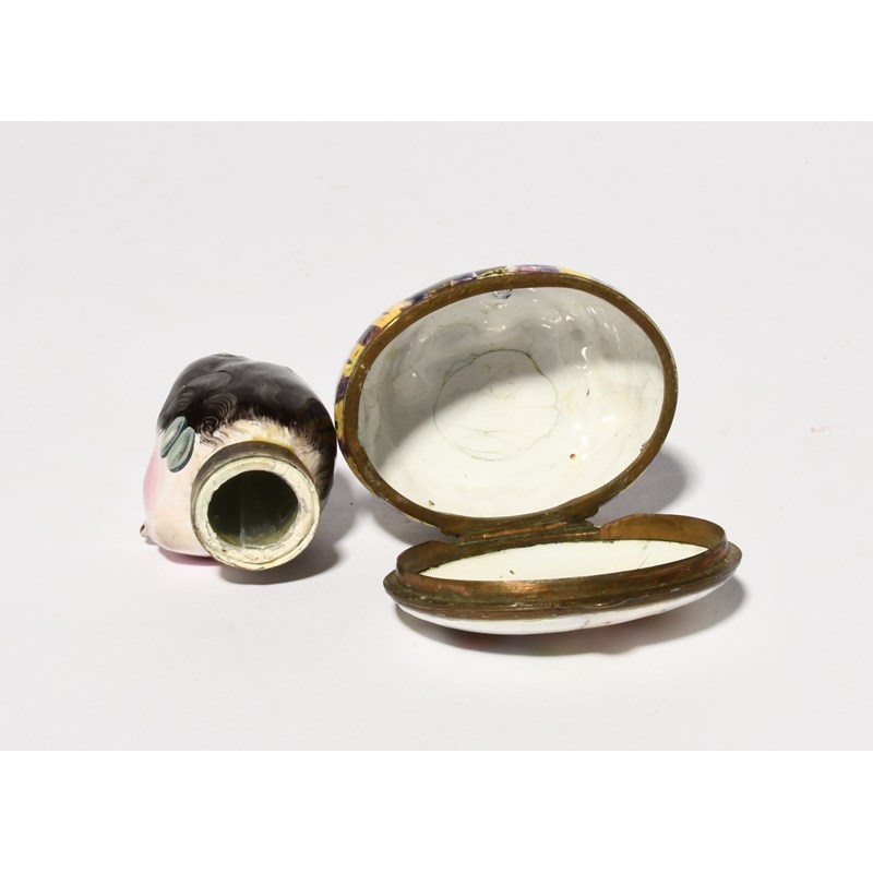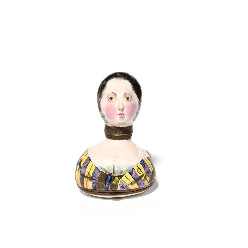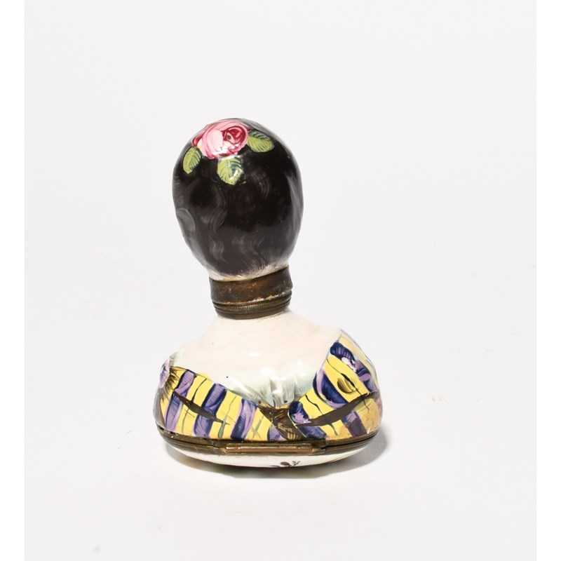 A rare South Staffordshire Jacobite portrait combined scent bottle and bonbonniere, c.1765, modelled as the head and shoulders of Flora MacDonald, wearing a purple and yellow tartan shawl, a pink rose in her hair, the hinged cover of the bonbonniere painted with flowers, some restoration to the bonbonniere's cover, 7.7cm.