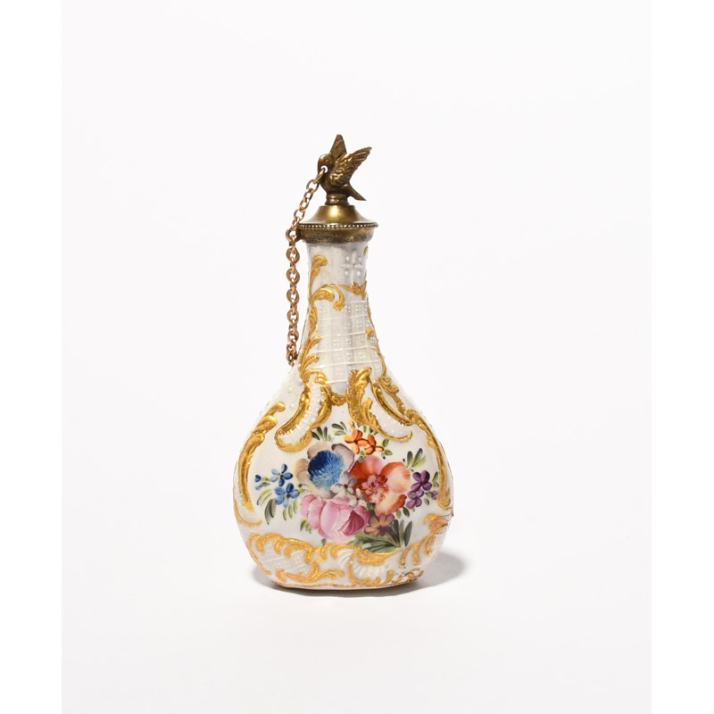 A Bilston or South Staffordshire enamel scent bottle, c.1780-90, the flattened pear-shaped body painted with a portrait of Anne Franks Day after Sir Joshua Reynolds, wearing a Woffington type hat and holding a small posy of flowers, the reverse with a panel of flowers, within raised gilt borders reserved on a textured white enamel ground, with silvered metal mounts, 10cm.