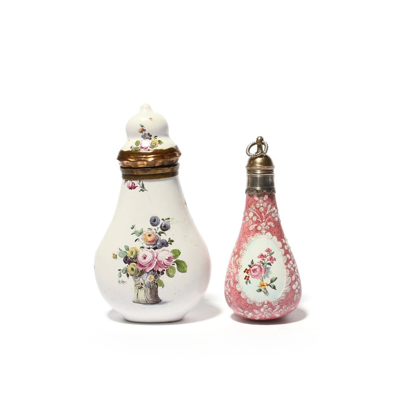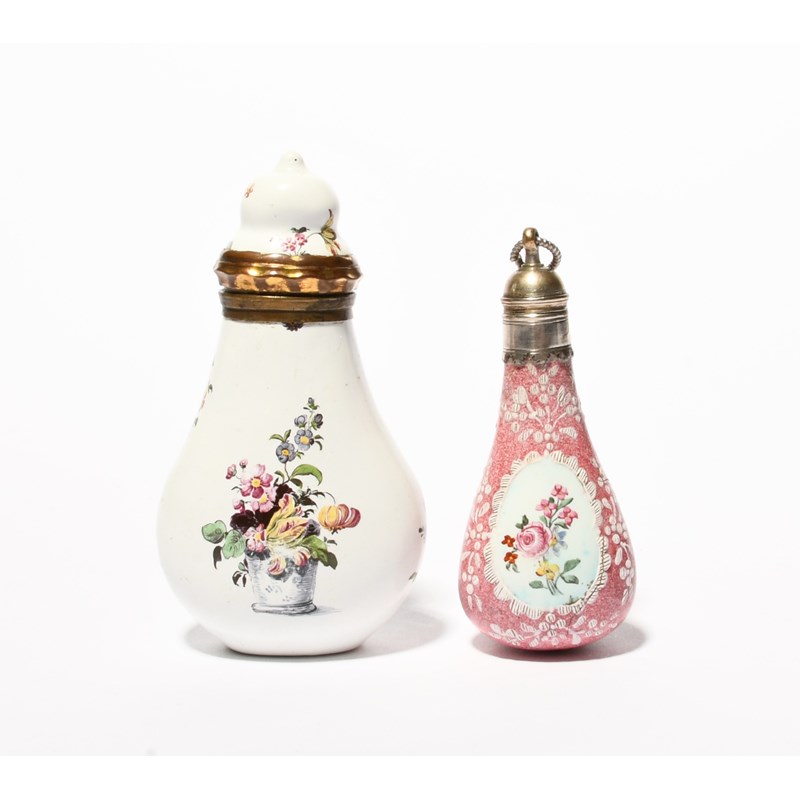 Two German enamel scent bottles or flasks, late 18th century, the larger painted with baskets of flowers on a white ground, the smaller with panels of flowers within white enamel floral borders on a powdered pink ground, the smaller with silver metal mounts, 8.4cm max. (2)