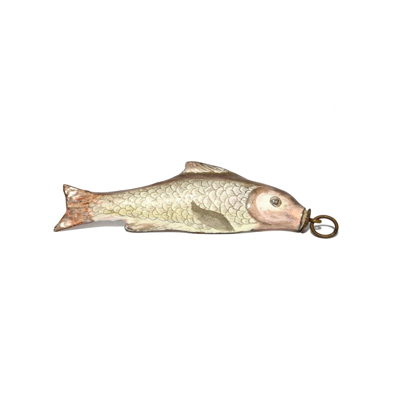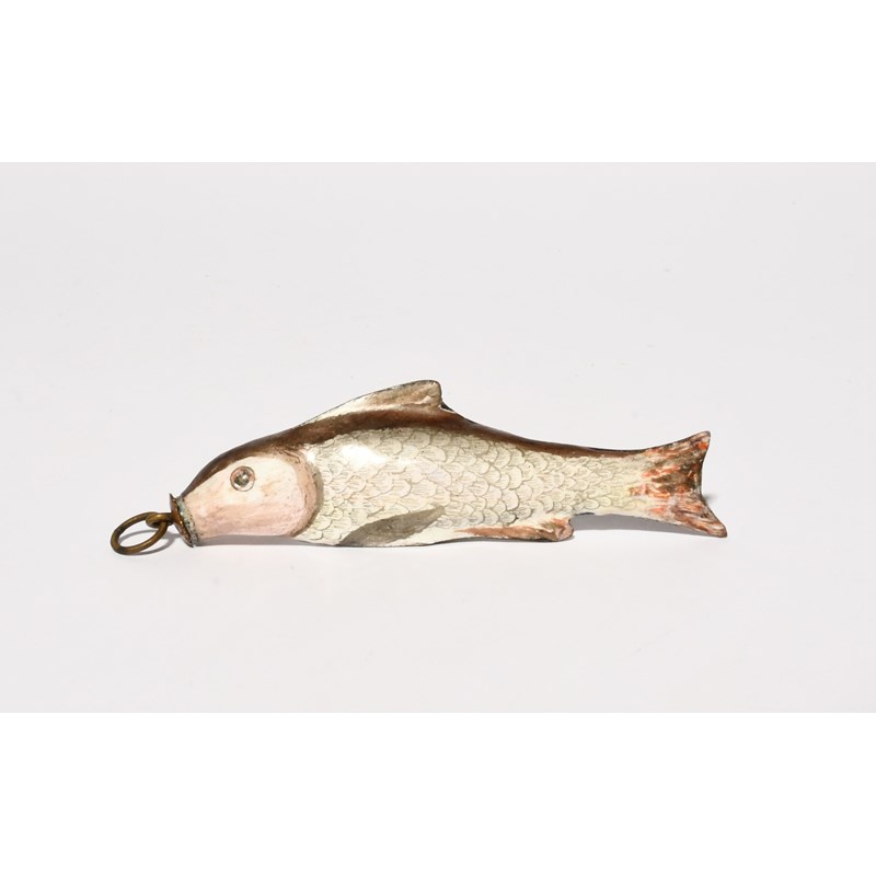 A Continental enamel scent bottle, late 18th/early 19th century, formed as a long fish with naturalistically painted scales, its mouth forming the aperture and fitted with a copper mounted stopper, 12cm.